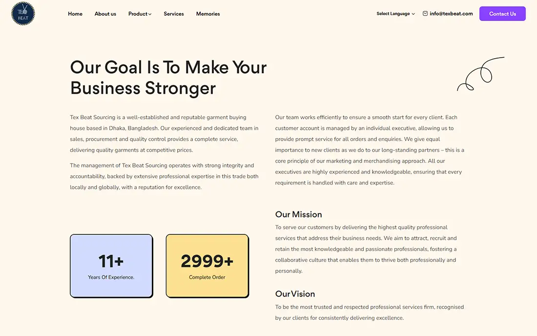 The final product is a robust, professional, and SEO-friendly website that serves as Tex Beat Sourcing’s global digital office.
